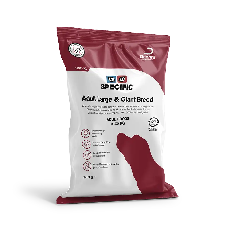 SPECIFIC™ Adult Large & Giant Breed CXD-XL to pełnoporcjowa i w pełni zbilansowana karma sucha dla psów dorosłych ras dużych w wieku do 6 lat i olbrzymich w wieku do 5 lat, powyżej 25 kg masy ciała.
