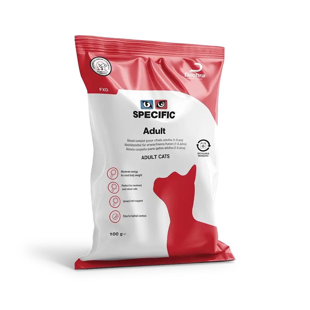 SPECIFIC™ Adult FXD to pełnoporcjowa i w pełni zbilansowana karma sucha dla kotów dorosłych w wieku do 8 lat.