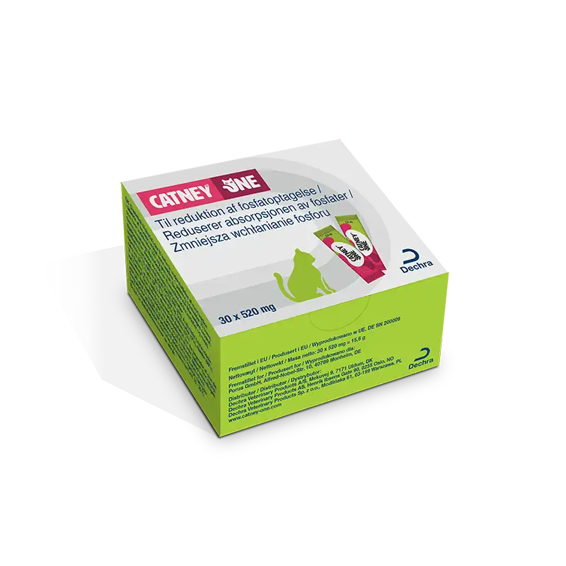 Początkowo zaleca się stosowanie 1 saszetki Catney® One na dzień. Po 2-4 tygodniach ilość może być dostosowana na podstawie pomiaru poziomu fosforanów w surowicy (w wyjątkowych sytuacjach również FGF23). Granulki należy dokładnie wymieszać z karmą. Podawanie Catney® One można rozłożyć na cały dzień, aby dopasować je do nawyków żywieniowych kota.