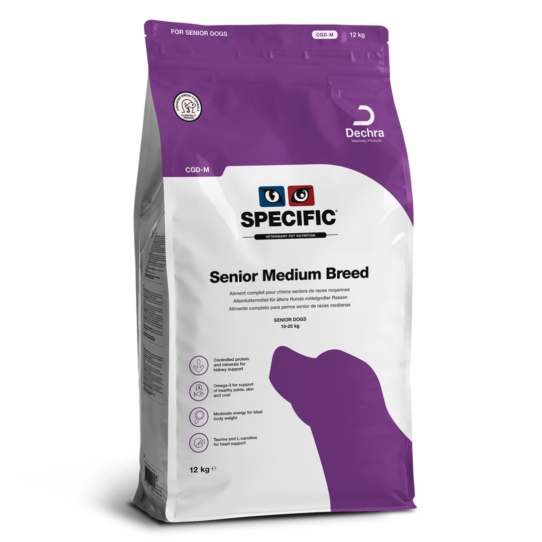 SPECIFIC™ Senior Medium Breed CGD-M to pełnoporcjowa i w pełni zbilansowana karma sucha dla psów starszych ras średnich w wieku powyżej 7 lat, o masie ciała 10-25 kg.