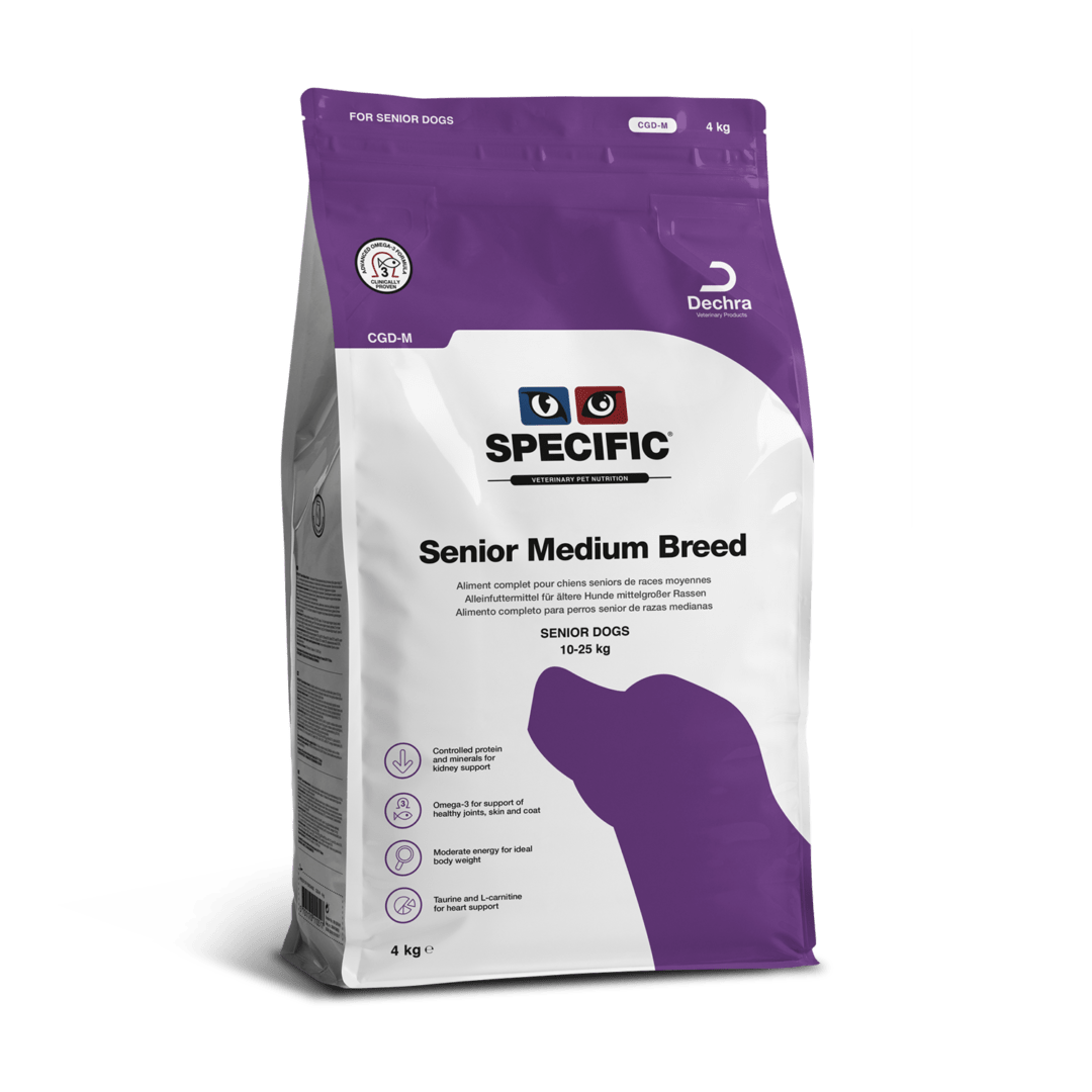 SPECIFIC™ Senior Medium Breed CGD-M to pełnoporcjowa i w pełni zbilansowana karma sucha dla psów starszych ras średnich w wieku powyżej 7 lat, o masie ciała 10-25 kg.