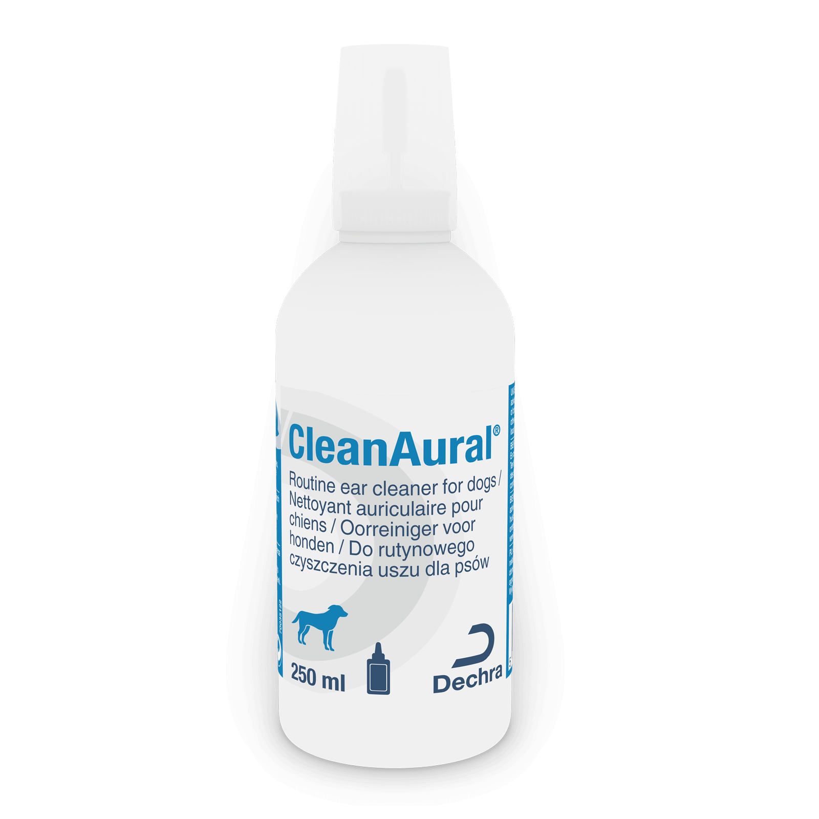 CleanAural Dog to płyn do rutynowej pielęgnacji uszu dla psów. Ma łagodne działanie rozpuszczające woskowinę, antyseptyczne i osuszające. Nie zawiera silnych keratolityków i substancji o silnym działaniu bójczym. pH jest neutralne dla środowiska psich uszu (6,3-6,9).