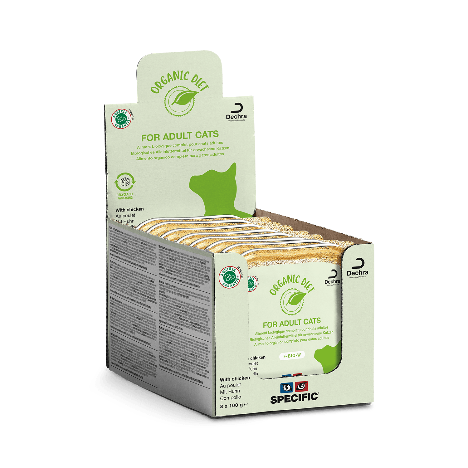 SPECIFIC™ Adult Organic with Chicken F-BIO-W to pełnoporcjowa i w pełni zbilansowana organiczna karma mokra z kurczakiem dla kotów dorosłych. Może być stosowana jako podstawa diety bądź smaczny dodatek. Karma mokra to także dobry wybór w przypadku kotów z cukrzycą lub idiopatycznym zapaleniem pęcherza.