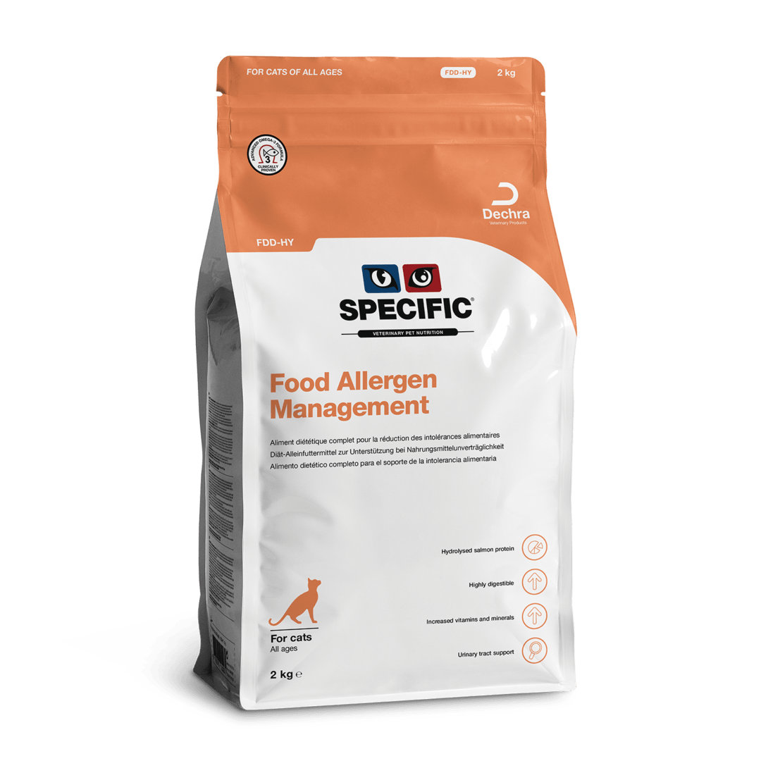 SPECIFIC™ Food Allergen Management FDD-HY to pełnoporcjowa i w pełni zbilansowana karma sucha dla kotów w każdym wieku, w tym kociąt.