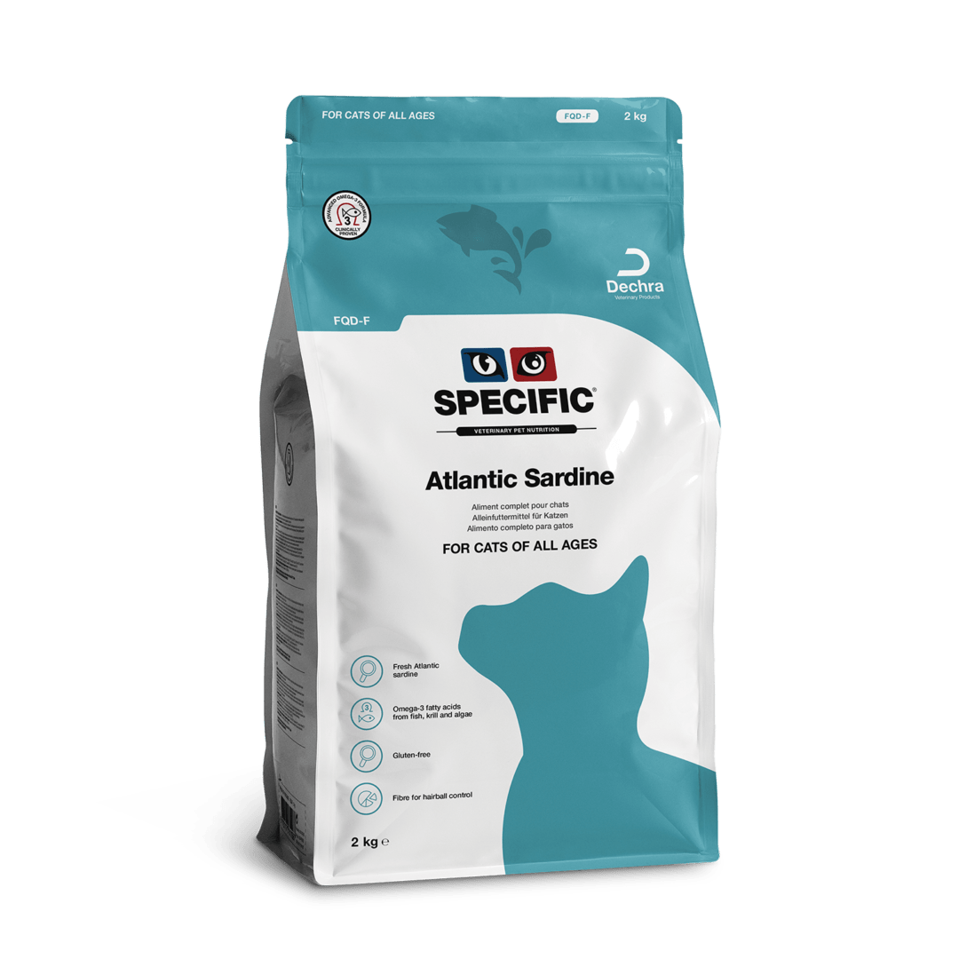 SPECIFIC™ Atlantic Sardine FQD-F to pełnoporcjowa i w pełni zbilansowana karma sucha dla kotów w każdym wieku.