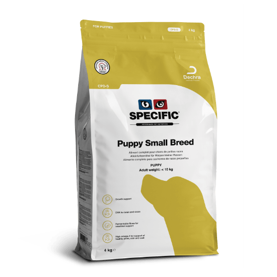 SPECIFIC™ Puppy Small Breed CPD-S to pełnoporcjowa i w pełni zbilansowana karma sucha dla szczeniąt ras małych, poniżej 10 kg masy ciała dorosłego psa, suk ciężarnych bądź karmiących wszystkich ras oraz psów wymagających karmy wysokoenergetycznej.