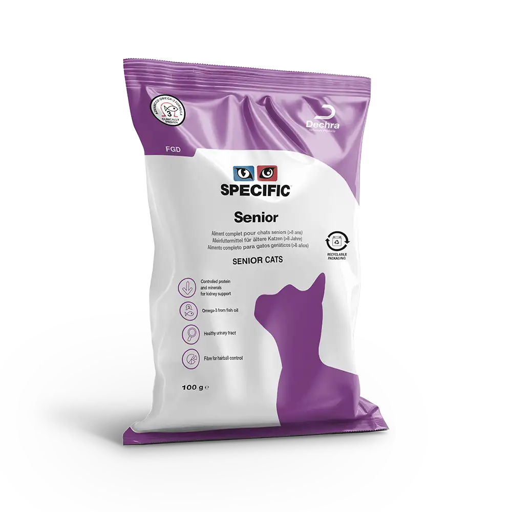 SPECIFIC™ Senior FGD to pełnoporcjowa i w pełni zbilansowana karma sucha dla kotów starszych, powyżej 8 lat.